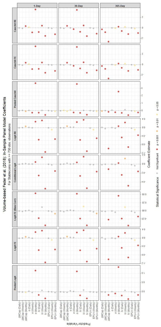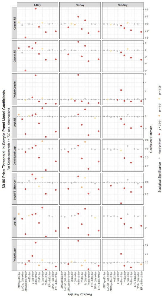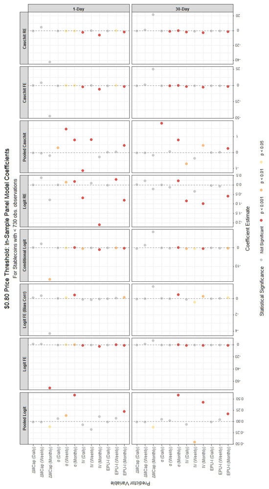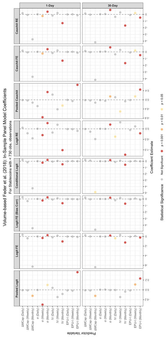 We remark that the inclusion of the Cauchit model is motivated not only by its empirical performance but also by its theoretical suitability for the dynamics observed in cryptocurrency markets. The Cauchit specification, which employs the cumulative distribution function of the Cauchy distribution as its link function, features much heavier tails than the Logit or Probit alternatives. This heavy-tailed structure makes it more robust to outliers and extreme realizations, features that are pervasive in cryptocurrency data due to abrupt price jumps, liquidity shocks, and irregular trading activity. In such environments, the Cauchit link can better accommodate extreme values of the latent variable without allowing them to disproportionately influence coefficient estimates or predicted probabilities, thereby improving robustness and interpretability [26,27]. From a conceptual perspective, the Cauchit model is particularly well suited for modelling binary outcomes characterized by long periods of stability followed by sudden regime shifts, such as stablecoin defaults. For most of their lifespan, stablecoins exhibit near-zero probabilities of failure that remain largely insensitive to small fluctuations in volatility or market capitalization. However, when confidence erodes, due to events like a breakdown in arbitrage mechanisms or a run on reserves, the same explanatory variables can trigger a rapid, nonlinear jump in the probability of default. The fatter tails of the Cauchit link function capture this abrupt transition more effectively than the smoother response of the Logit model, allowing for a more realistic representation of these threshold-driven dynamics [28]. Moreover, the Cauchit model’s slower tail decay allows for flexible modelling of rare but economically meaningful events, where the probability mass in the extremes carries critical information about systemic fragility. This property makes it especially appropriate for stablecoin markets, where extreme depegging episodes (such as the TerraUSD collapse) represent defining moments for the system’s stability. Its robustness to heavy-tailed distributions ensures more stable parameter estimates even in the presence of volatile price movements or sudden market capitalization changes. Additionally, when applied to panel data, the Cauchit specification accommodates unobserved heterogeneity across stablecoins with varying lifespans, further enhancing its suitability for this context. These theoretical advantages, together with its strong empirical performance with cryptoassets [14], justify its inclusion alongside the Logit and Probit models as a robustness check against thin-tailed assumptions.