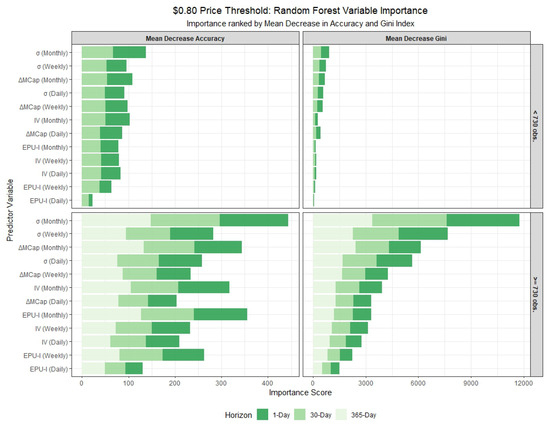 - Random Forests Model: In addition to the panel binary models, a random forests model was employed. This non-parametric ensemble method builds multiple decision trees on random subsets of the data and averages their predictions. It was selected due to its proven effectiveness in forecasting PDs of cryptocurrencies, crypto exchanges, and in detecting pump-and-dump schemes involving crypto assets, as documented in [14,24,25].