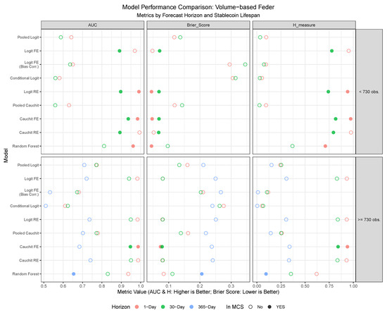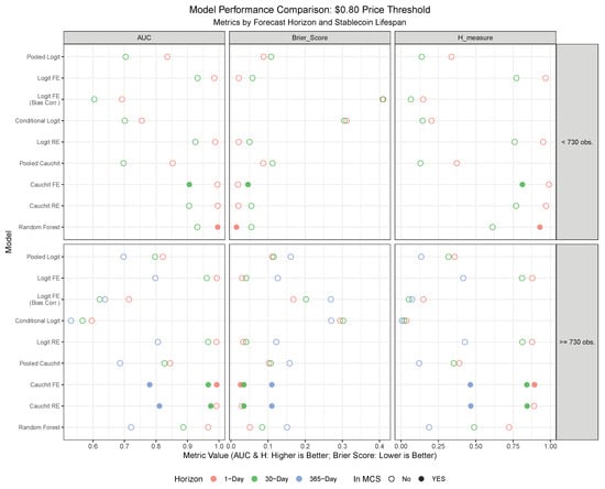 As detailed in Section 3.1, we applied two competing criteria to classify stablecoins daily as dead or alive/resurrected: the volume-based approach in [5], and our price threshold method at $0.80, deeming a coin dead if its price falls below 80 cents, and alive or resurrected if above or recovering above 80 cents, respectively. The CoinMarketCap final listing status was not used for daily analysis, as it reflects only the end-of-sample status. The dataset of 39 stablecoins with fewer than 730 observations spans February 2021 to November 2024 (11,558 daily observations), while the 59 stablecoins with more than 730 observations span January 2019 to November 2024 (76,176 daily observations). Following [14,15], we employed direct forecasts, using 1-day lagged regressors for 1-day ahead PDs, 30-day lagged regressors for 30-day ahead PDs, and, for coins with over 730 observations, 365-day lagged regressors for 365-day ahead PDs.