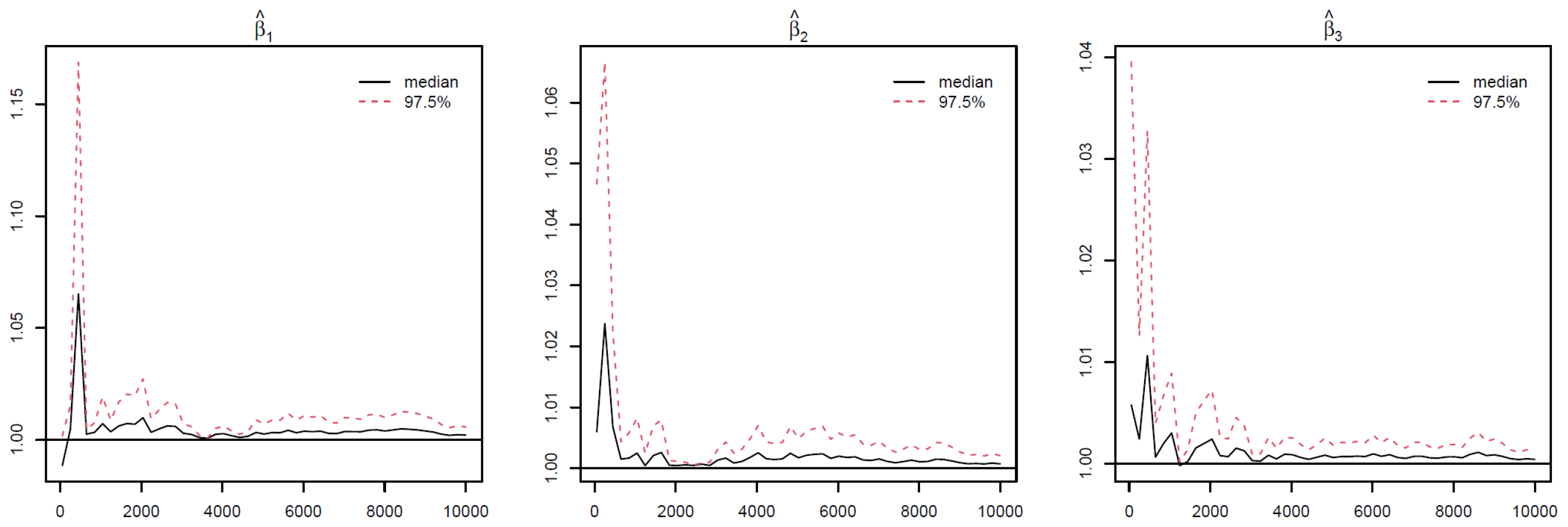 Figure 3. The PSRF trajectories for the three Race dummy variables corresponding to Non-Hispanic white, Non-Hispanic black, and other race categories, respectively. For each parameter, the median PSRF (solid black line) rapidly approaches and stabilizes near 1.00, and the upper 97.5% quantile (dashed red line) remains well below the commonly used threshold of 1.1 after early iterations. This pattern indicates good mixing and convergence of the Markov chains for all three race coefficients. The initial variability observed in the early iterations diminishes quickly, further supporting the conclusion that the chains have converged. These results suggest that posterior inference for the race-related coefficients is reliable and based on well-converged MCMC samples. The convergence assessment is further supported by the effective sample size (ESS) and Monte Carlo standard error (MCSE) analyses. As shown in