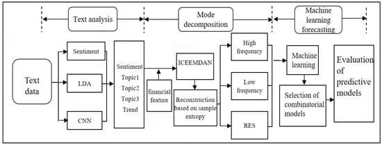 The research framework of this study is illustrated in Figure 1. First, textual data from carbon trading-related news were processed and temporally aligned with their corresponding dates. Then, a combination of sentiment analysis, LDA modeling, and CNN was leveraged to distill multi-dimensional textual features from the online news data. Next, the extracted textual features and financial variables were decomposed using the ICEEMDAN method. In accordance with the sample entropy (SE) principle, the resulting intrinsic mode functions (IMFs) were then reconstructed into high-frequency, low-frequency, and trend components. Finally, the reconstructed sub-sequences were input into multiple machine-learning models to identify the most effective ensemble forecasting model.