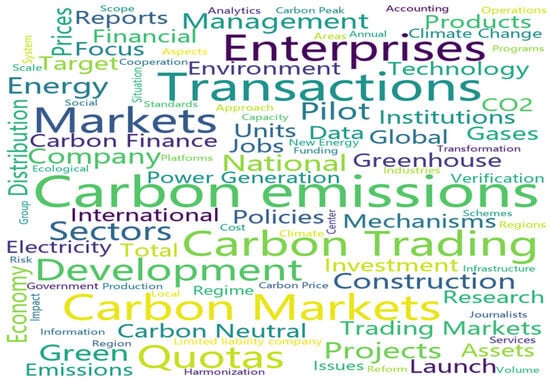 The downloaded news data underwent a series of preprocessing steps. Firstly, garbled characters and irrelevant news entries were removed. Then, a manual review was conducted to exclude articles with low relevance to the carbon market, thereby minimizing noise from unrelated content. This process yielded a final corpus of 83,425 valid news articles. Articles published on non-trading days were subsequently excluded to align the data with market activity. A word cloud generated from the cleaned text is shown in Figure 2.