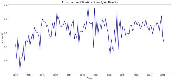 where denotes the score of the sentiment word. The variable indicates whether a negation word appears before the sentiment word; its value is set to −1 if such a negation is present. The variable n represents the number of negation words surrounding the sentiment word, and refers to the degree adverb that precedes the sentiment word. Following the methodological framework developed by Zhao et al. [49], this study employs a hybrid methodology, integrating the degree adverb lexicon from the Hownet database (CNKI) with a negative polarity lexicon to construct a 10-level classification system freaturing calibrated intensity weights: extremely/most (2.0), very (1.9), quite (1.8), more (1.7), relatively (1.6), appropriately (1.5), slightly (1.4), insufficiently (1.2), excessively (1.1), and somewhat (0.8).