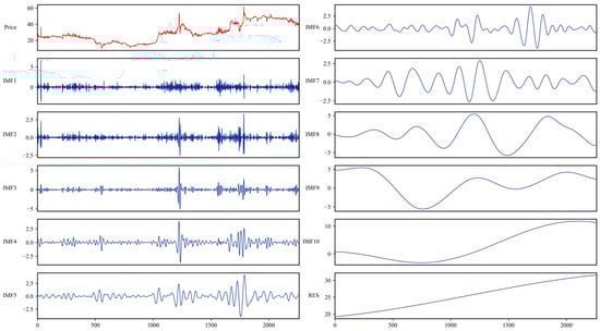 Moreover, the relative importance of textual versus financial features in carbon price forecasting is time-varying. Furthermore, the nature of market drivers differs temporally: national climate policy announcements can reshape long-term market expectations, whereas energy-price swings and speculative trading are typically associated with short-term fluctuations. This leads to the dynamic evolution of feature importance [9]. To capture these heterogeneous temporal patterns, we employ advanced mode-decomposition techniques to decompose carbon prices and related variables. This process reduces noise interference, thereby providing the forecasting model with purified, well-defined frequency-specific input features.