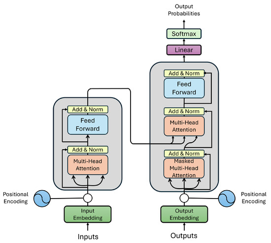 To address the aforementioned challenges, Vawsani et al. proposed a novel model called the Transformer [18]. By eliminating recurrence and instead leveraging an attention mechanism, Transformers can capture global dependencies across input and output sequences while enabling parallel computation. The attention mechanism is the core component that allows the model to dynamically focus on different parts of the sequence. This design significantly improves efficiency and scalability, especially for long sequences. The Query, Key, and Value components are calculated by multiplying the input to , , and , respectively, where , , and are learned weight matrices. The attention mechanism determines the relevance between the queries and keys passed through the softmax function to produce probabilities. The output, which is the weighted sum of the values, is computed by a dot product in Equation (7). Figure 2 demonstrates the architecture of the transformer model.
