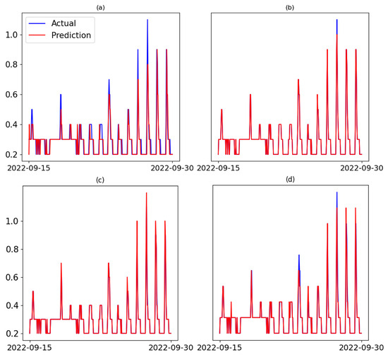 To compare the performance of Transformer models across different loss functions in this study, we selected MSE as the baseline. Similar to other models, we utilized grid search when implementing loss functions to find the best set of hyperparameters. Therefore, a quantile of 0.8 was chosen for the pinball loss function. For the EP loss function, we set T = 0.8 with penalty factors of and assigned. Finally, for the Huber loss function δ = 0.4 was chosen. The parity plots of predicted vs. actual values for Transformer models using different loss functions are shown in Figure 5. The dashed lines represent perfect predictions in the figure. It can be seen that for the model using MSE as the loss function, the model failed to capture most of the peak values when the actual value rose to above 0.4, and overall, we are facing an underestimation situation. The parity plot Figure 5b shows that using the Pinball loss function, even though it can increase the underestimations, it still fails to fully capture the peak values, and a dispersed prediction for the values above 0.4 can be observed. Using Huber and EP loss functions, on the other hand, did the best performance in capturing underestimation and overestimation among all four of them. Although we can still see a small underestimation on the peak values, it greatly enhanced the model’s performance on peak prediction.