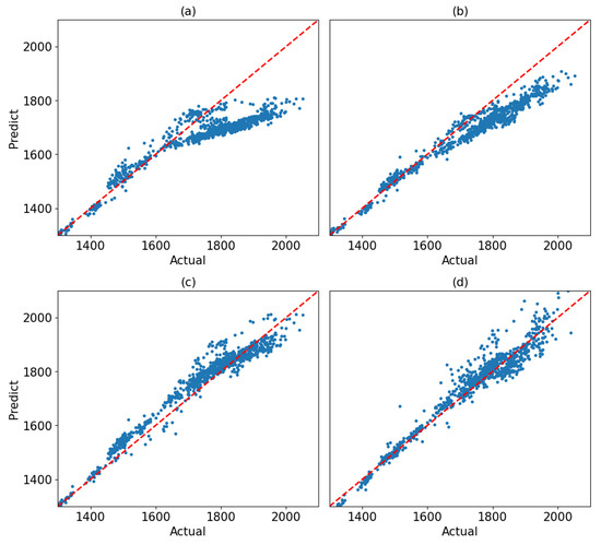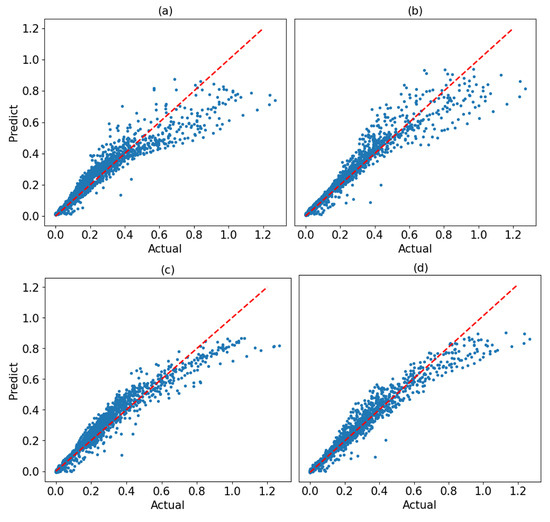 The parity plots of predicted vs actual values for Transformer models using (a) MSE, (b) the Pinball loss function, (c) Huber, and (d) the EP loss function. Each blue dot represents a prediction–actual pair, and the red line denotes perfect agreement. Points lying below the line indicate underestimation, while points above the line indicate overestimation.