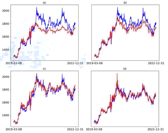 The predicted gold price on the test set from Transformer models using (a) MSE; (b) the Pinball loss function; and (c) Huber loss function, and (d) EP loss function. In the plots, the blue lines demonstrate actual values, and the red lines represent the prediction.