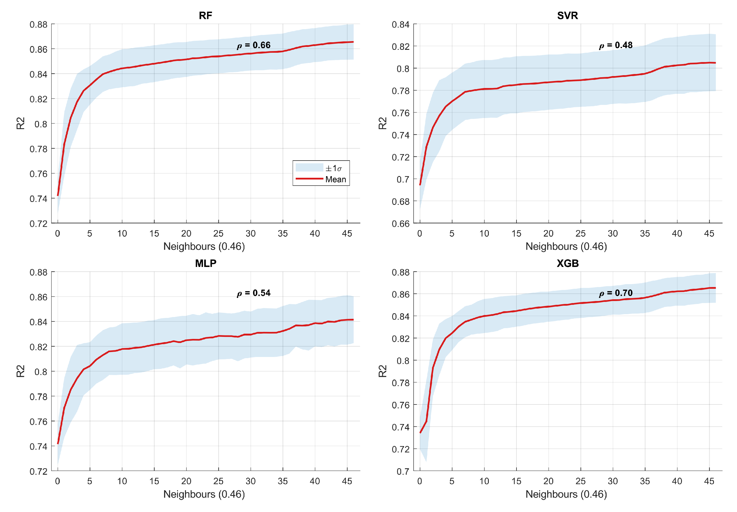 The R2 metric increases significantly as nearby neighbors are included, confirming that spatial information enhances the explanatory power of the model. The improvement tapers off with larger neighbor counts, consistent with the saturation behavior observed in MAE and RMSE.