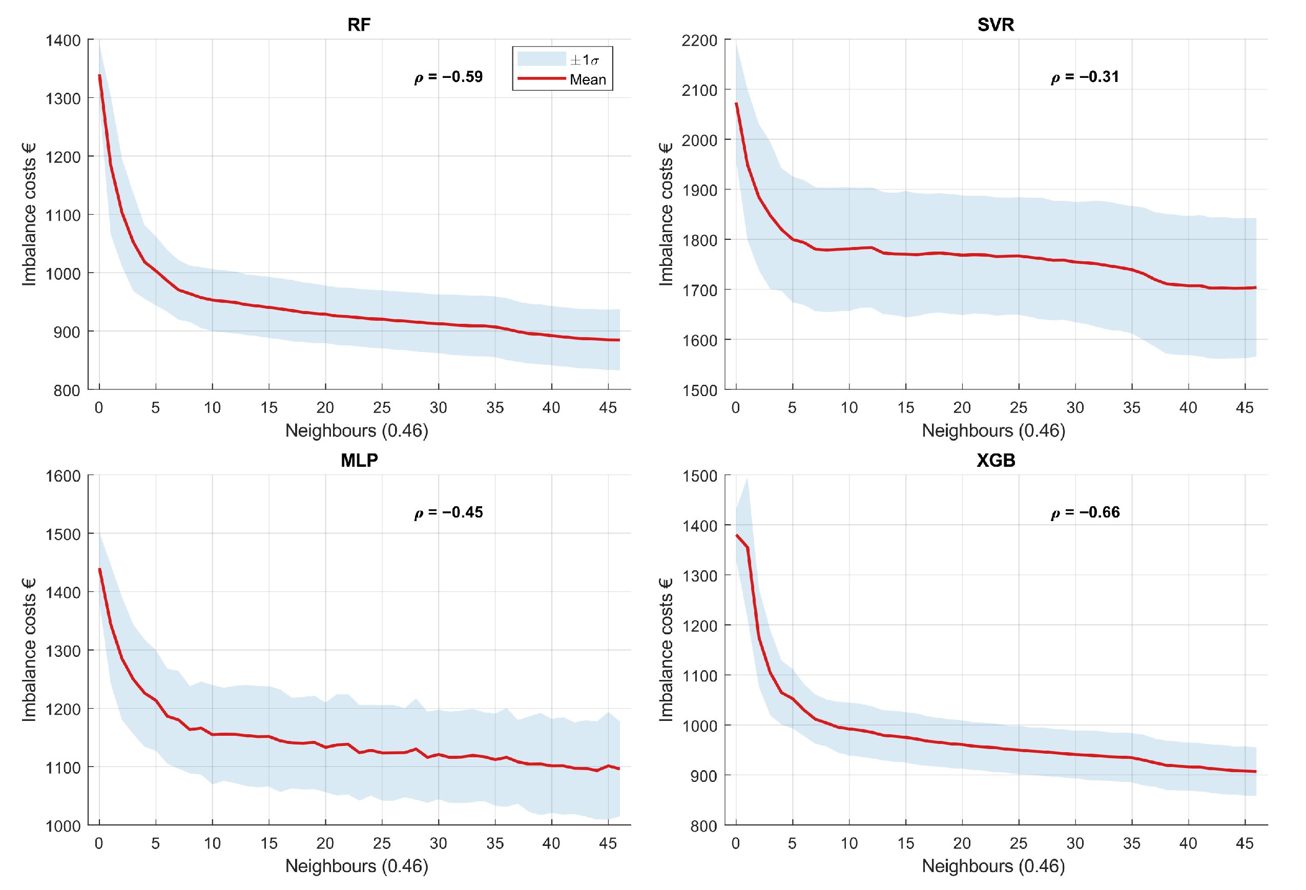 Figure 6 illustrates the reduction in imbalance costs as the network density increases, using the Random Forests model as representative. The economic costs show a clear decreasing trend with the increase in the network density, mirroring the improvements in forecasting accuracy. The most significant cost reductions occur within the first 10–15 neighboring installations, with diminishing returns beyond this threshold.