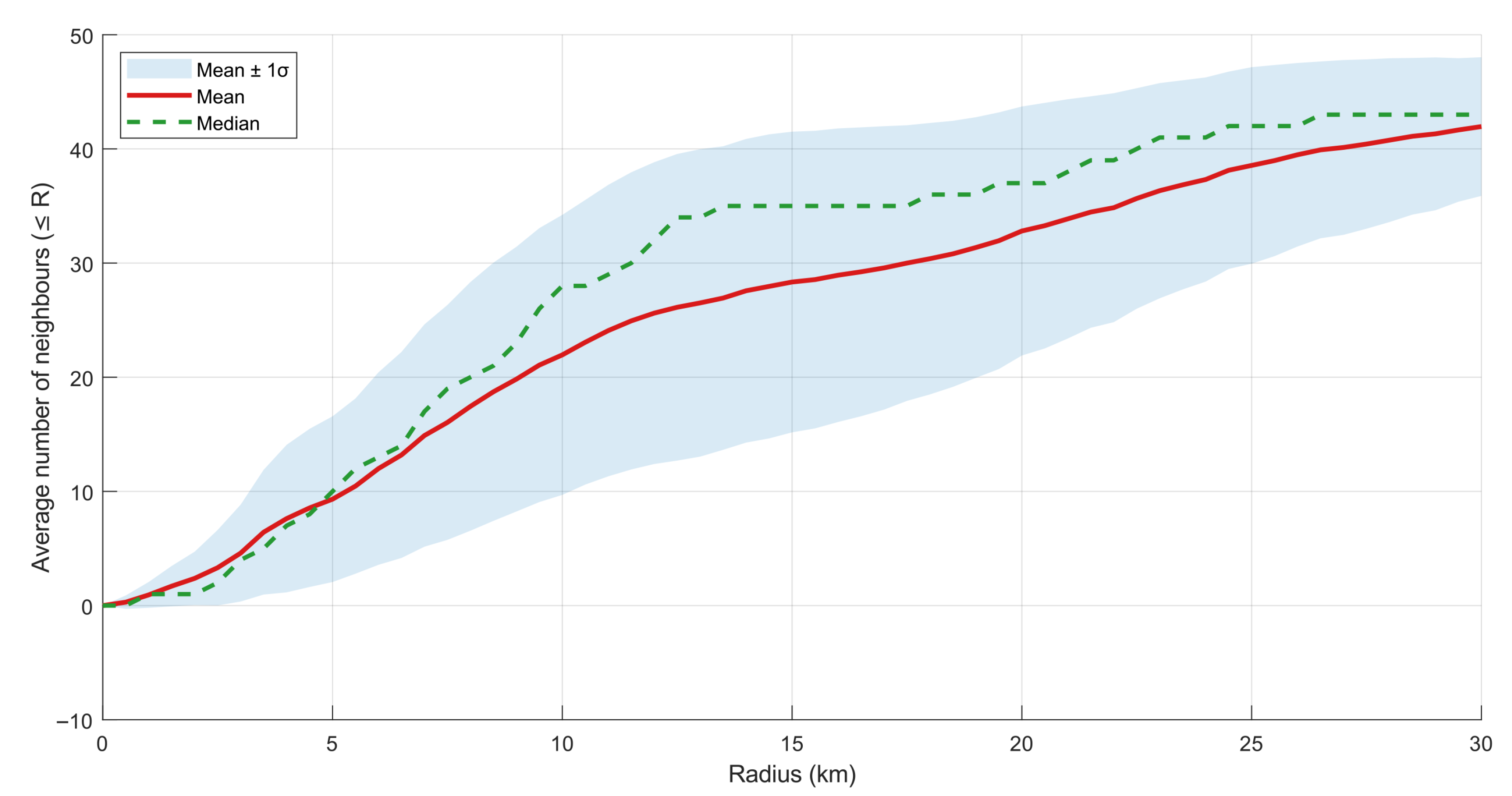 Intermediate radii (5–15 km) show median exceeding mean, demonstrating above-average connectivity for most systems. Large radii (≥20) exhibit convergence of mean and median values, indicating uniform connectivity as the network approaches completeness. The standard deviation pattern peaks at 15 km radius () when connectivity variability is maximized, then decreases with network uniformity.