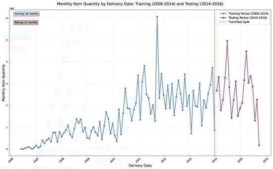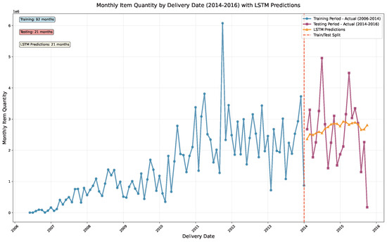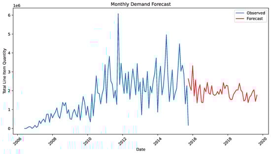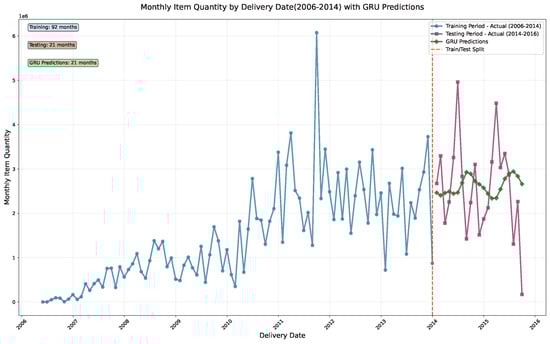 We applied advanced LSTM and GRU models, both types of RNN with multilayered deep learning, for forecasting pharmaceutical demand based on historical data. The LSTM model implemented the gating mechanisms described in Equations (2)–(7), while the GRU model utilized the simplified architecture shown in Equations (8)–(11). The dataset covering monthly item quantities from 2007 to 2016 was split into training and testing sets (80 months training, 20 months testing). ARIMA (order 1,0,1) achieved MAE = 0.0576, RMSE = 0.0758, and R2 = −0.3573 on the held-out period, providing the lowest error but limited explanatory power. LSTM produced higher RMSE (0.1589) than ARIMA yet outperformed GRU (0.1639) and captured nonlinear demand surges more faithfully. Both deep learning models tracked overall trends but struggled with volatility, highlighting areas for improvement and indicating that H1 was only partially supported. Figure 1 indicates observed monthly demand patterns, while Figure 2 displays observed and forecasted demand trends. Figure 3 shows the monthly item quantity by delivery date across training and testing periods. Figure 4 and Figure 5 illustrate the performance of the LSTM and GRU models, demonstrating their ability to capture temporal patterns in pharmaceutical demand on a global scale given fluctuating needs.