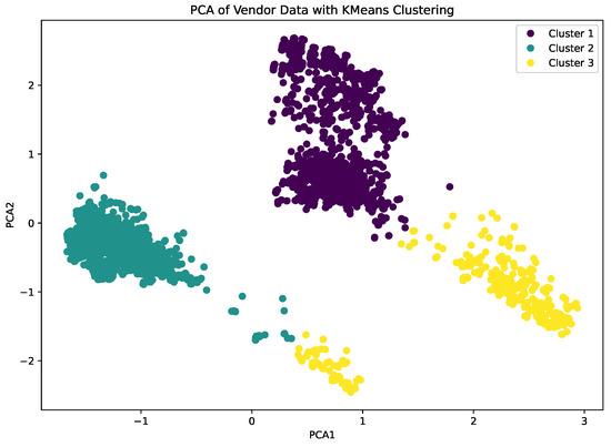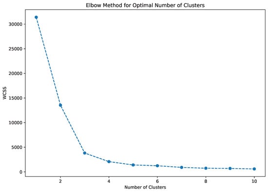 Before applying K-Means clustering, an unsupervised ML algorithm designed for grouping similar data points without predefined labels and revealing hidden patterns, we used PCA dimensionality reduction to obtain a smaller set of linearly uncorrelated variables. The PCA transformation was performed using Equation (15) to identify the principal components with maximum variance.