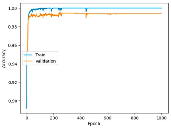 Figure 2 depicts the training progression of an ANN model, showing Accuracy plotted against Epoch number for both training and validation datasets. The model exhibits very fast learning and high performance from the outset, with both training and validation accuracies exceeding 98% within the first 100 epochs. The training accuracy (blue line) quickly approaches 1.00 (or 100% accuracy), whereas the validation accuracy (orange line) stabilizes slightly lower, leveling off near 0.99 (or 99% accuracy). Notably, the training accuracy consistently remains a bit higher and more variable than the validation accuracy after the initial convergence. Despite a minimal generalization gap, where training accuracy slightly surpasses unseen validation performance (the difference being minor), the validation accuracy remains exceptionally high and stable throughout the 1000 epochs. As the validation accuracy does not exhibit a significant decline nor excessive fluctuations over the entire 1000 epochs, the plot affirms that the trained model is highly robust and capable of sustaining its high prediction accuracy on new financial data, indicating it has achieved an optimal learning state for this specific task.