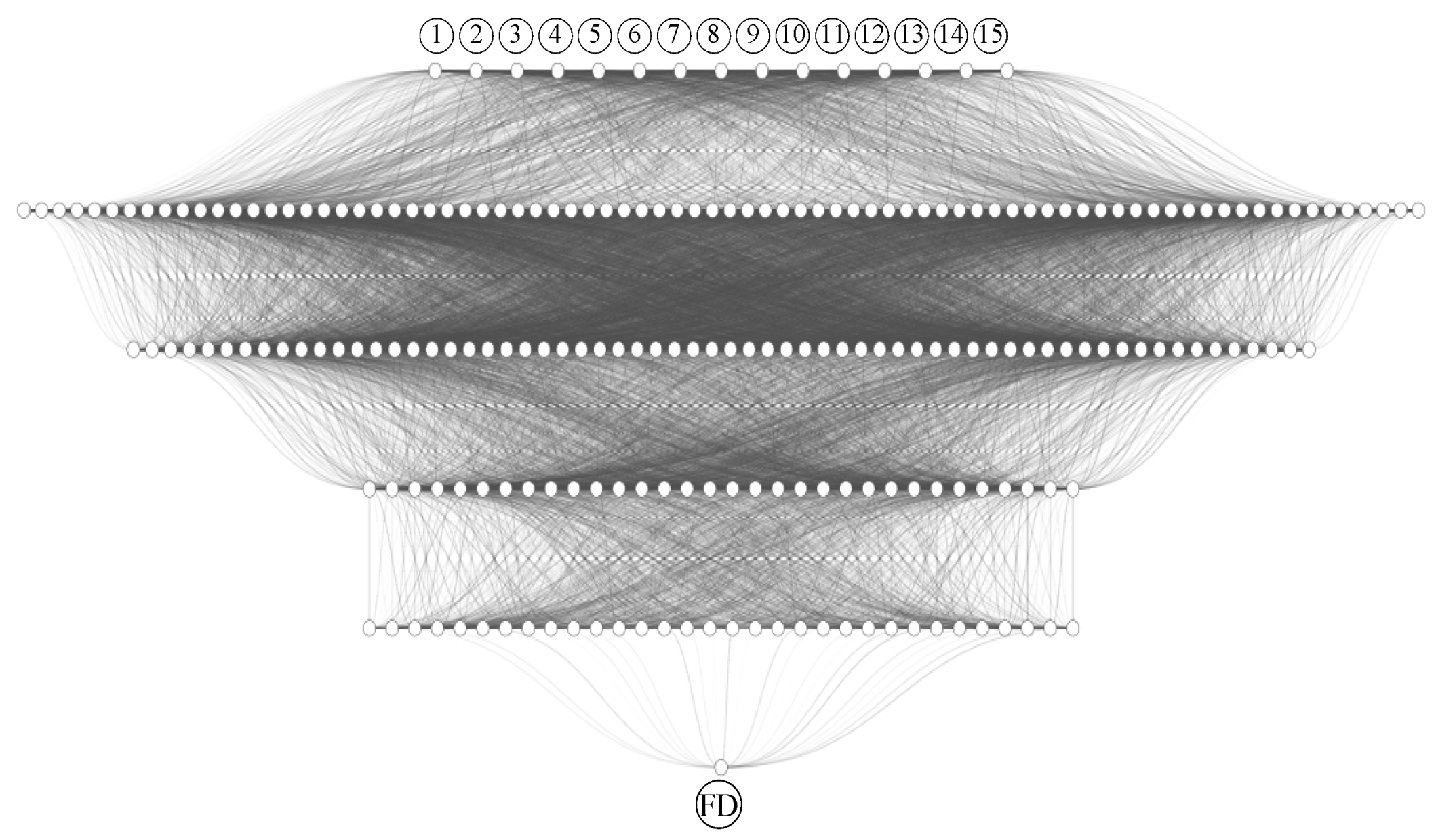 Figure 1 represents a neural network architecture designed for financial distress prediction. The described neural network architecture can be termed a deep feedforward neural network or simply a deep neural network (DNN) designed for a binary classification task. It is specifically tailored for the task of predicting the binary output variable FD based on the input features ROAA, GP, OE, OGP, TAG, IE, ART, IT, CAA, WCD, REA, ORA, DE, and AGP.