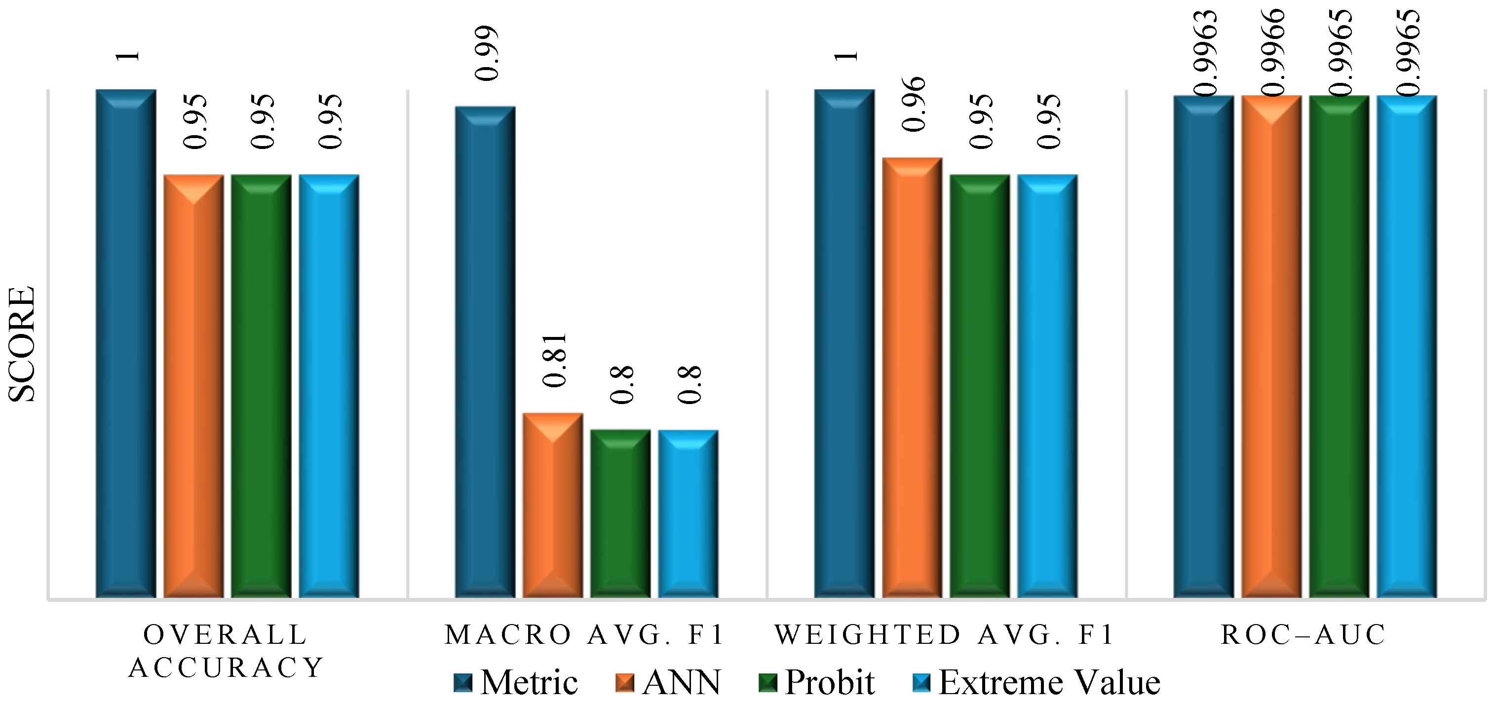 Figure 3 illustrates key differences in classification performance. While all models demonstrate similarly high overall accuracy (ranging from 0.95 to 1), the ANN significantly outperforms traditional models in terms of Macro Average F1-score (0.81 for ANN vs. approximately 0.80 for others), indicating better balanced performance across both classes. The Weighted Average F1-score further confirms this trend, with the ANN achieving 0.96 compared to 0.95 for probit and extreme value models.