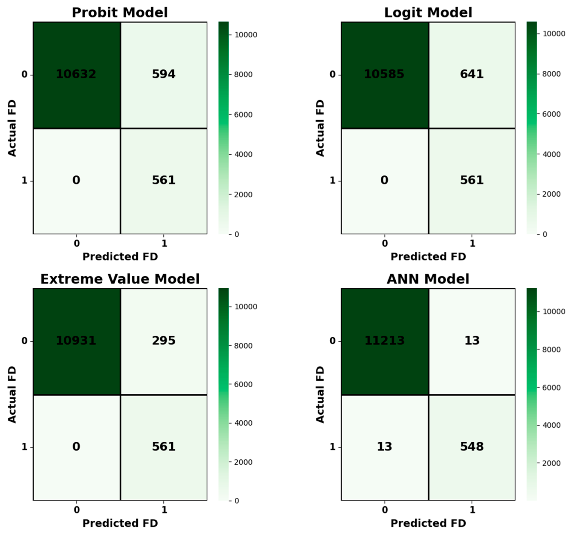 Figure 4 illustrates the effectiveness of the binary classification model developed for Financial Distress (FD) Prediction. The comparative analysis of the four models—ANN, Extreme Value, Logit, and Probit—reveals distinct trade-offs in their performance for Financial Distress (FD) prediction, where the total number of actual distressed cases (Actual FD = 1) is 561 across all models. The ANN model demonstrates the best overall balance by achieving the lowest counts for both False Positives (FP = 13) and False Negatives (FN = 13), making it the most accurate model across the entire dataset.