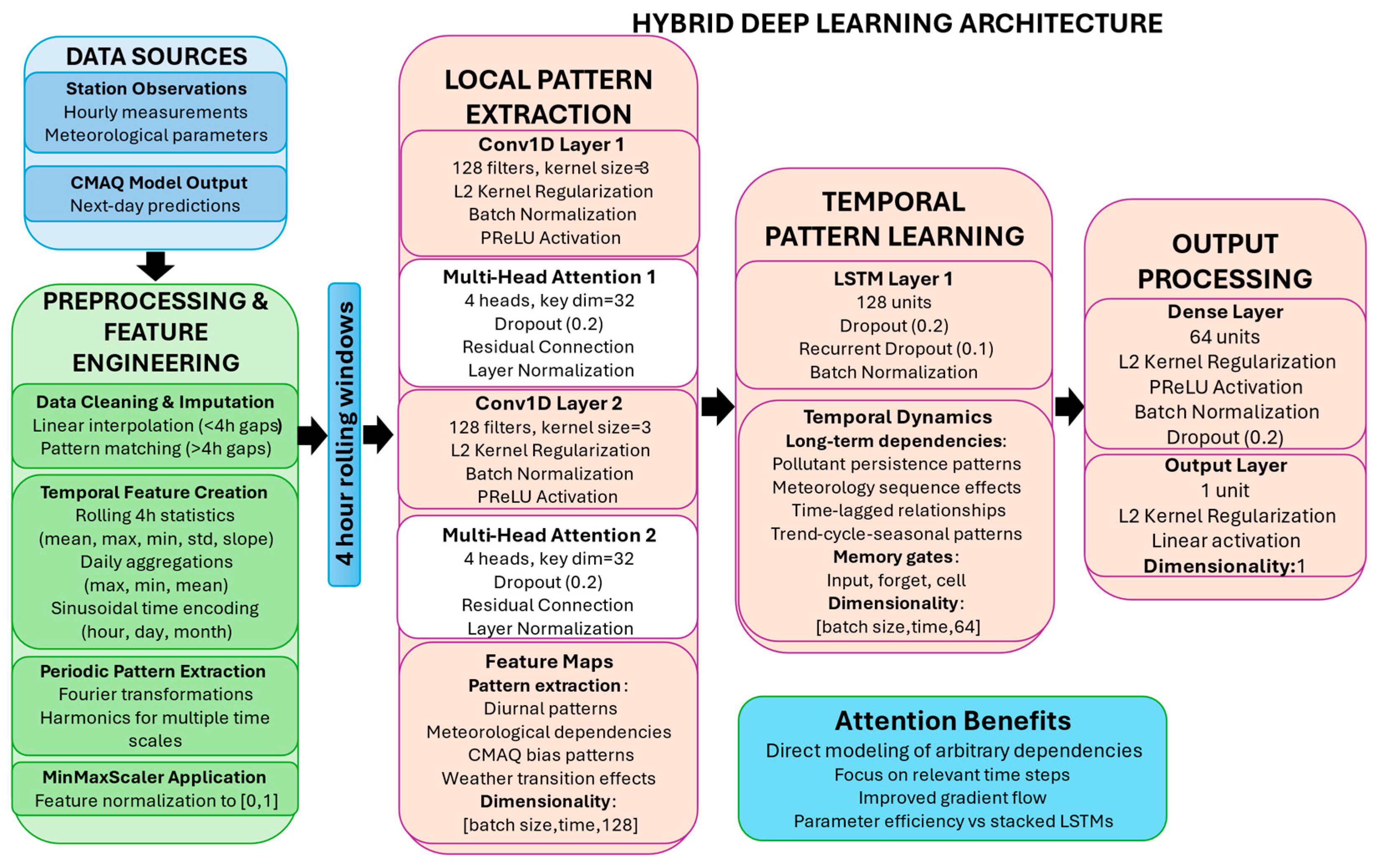 35] where multiple standalone and hybrid deep learning configurations were systematically evaluated. In that study, extensive sensitivity analyses were conducted to examine the impact of architectural design choices, including the number of CNN and LSTM layers, the selection of Conv1D filter counts, and the allocation of LSTM units, as well as the influence of different loss functions (e.g., MSE, Huber, asymmetric, and quantile-based formulations) on forecast accuracy, bias reduction, and event detection skill. These analyses demonstrated that the selected hybrid CNN–LSTM configuration provides an optimal balance between model complexity, generalization, and computational efficiency. Building on those findings, the present work focuses on further refining this validated architecture and quantifying its added value relative to the CMAQ baseline, rather than reproducing inter-model comparisons that have already been extensively documented.