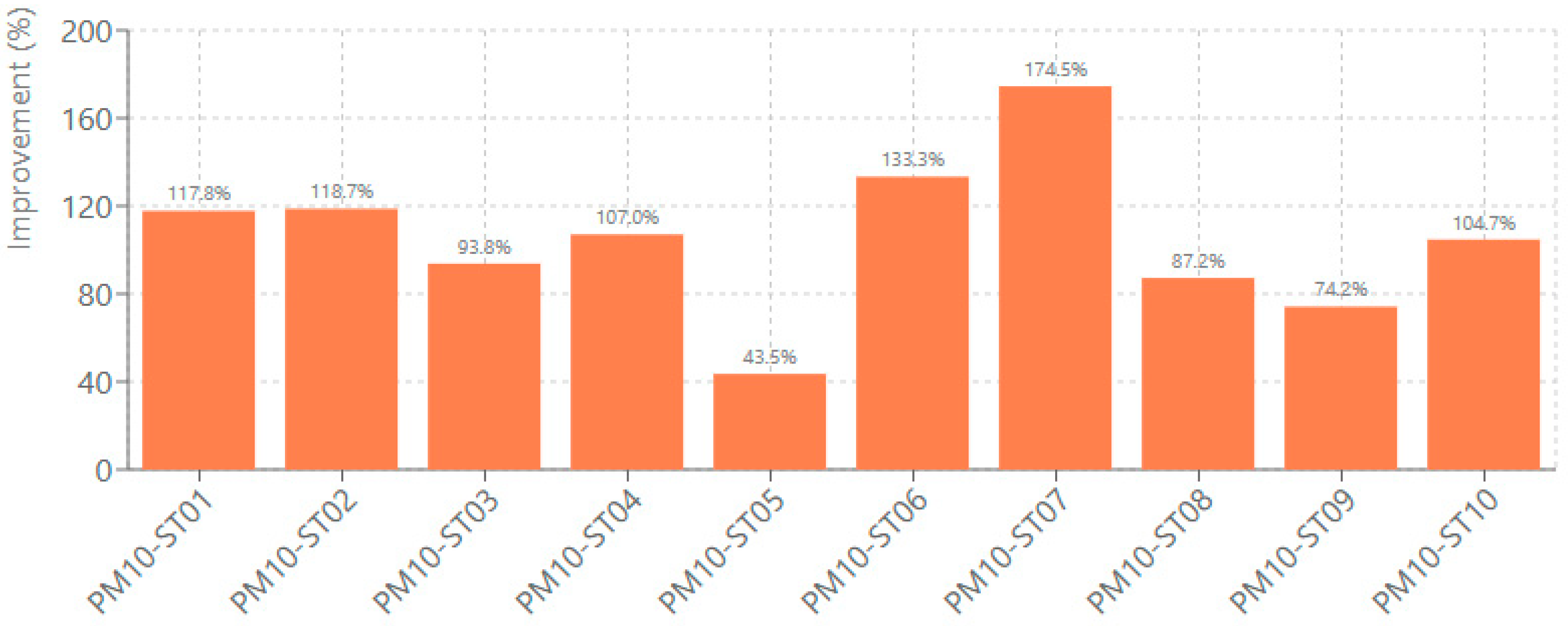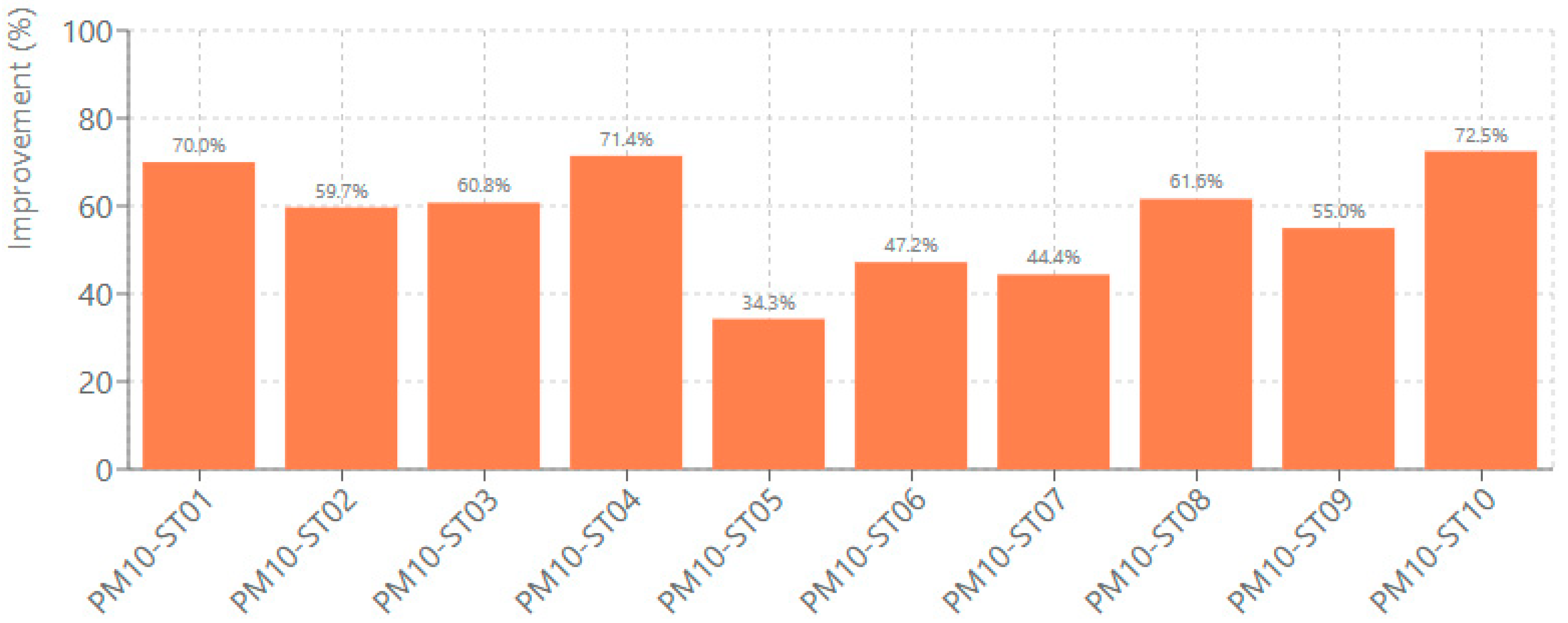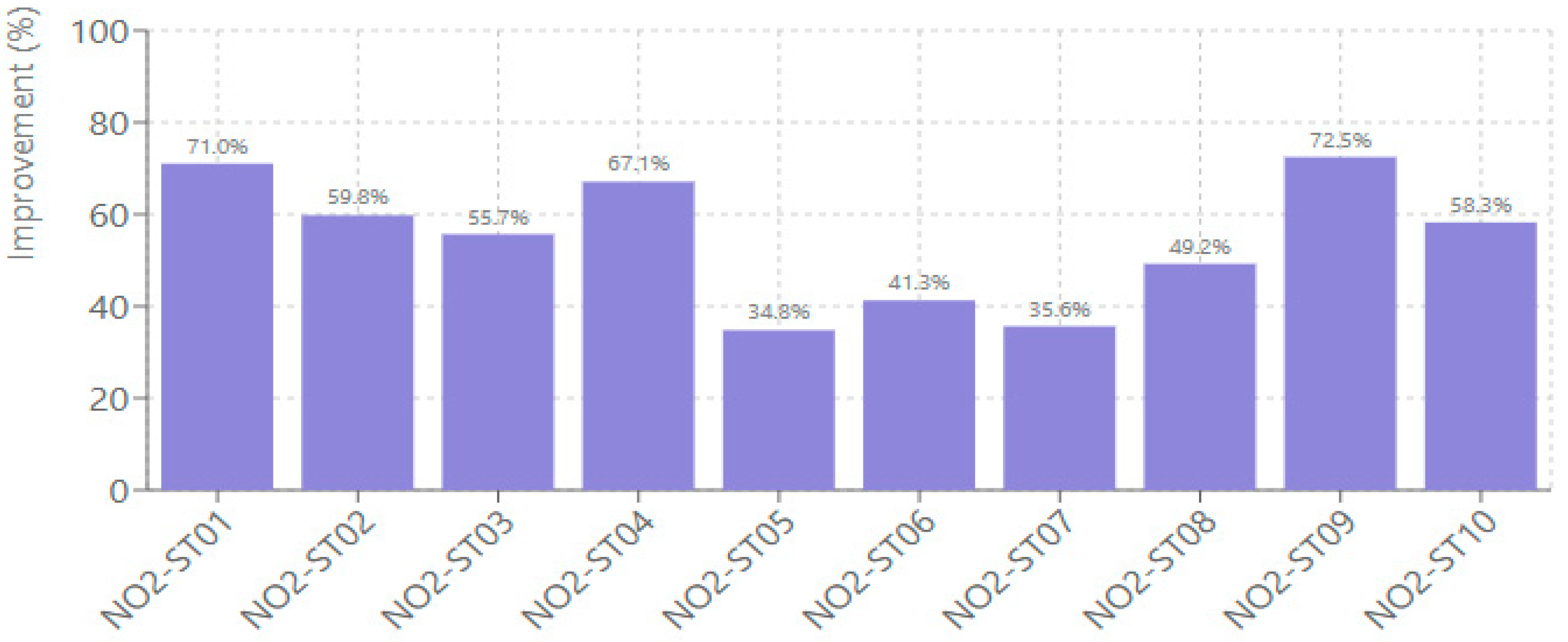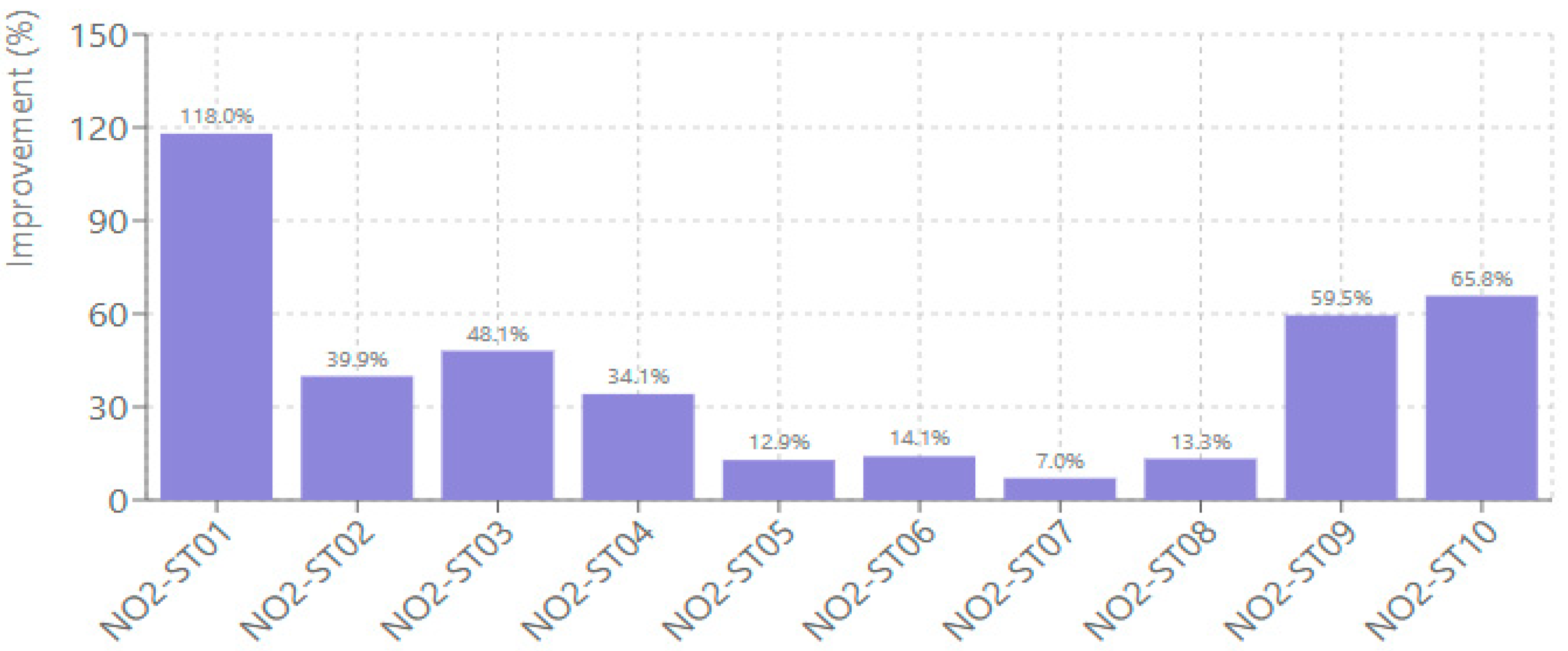 Station-specific analysis revealed distinct performance patterns across the monitoring networks. For NO2 predictions, stations NO2-ST01 and NO2-ST09 consistently demonstrated the greatest improvements across multiple metrics, while stations NO2-ST05 and NO2-ST07 showed more conservative but still meaningful enhancements. For PM10 predictions, station PM10-ST03 achieved notable performance across error reduction metrics, while station PM10-ST07 excelled in agreement metrics.