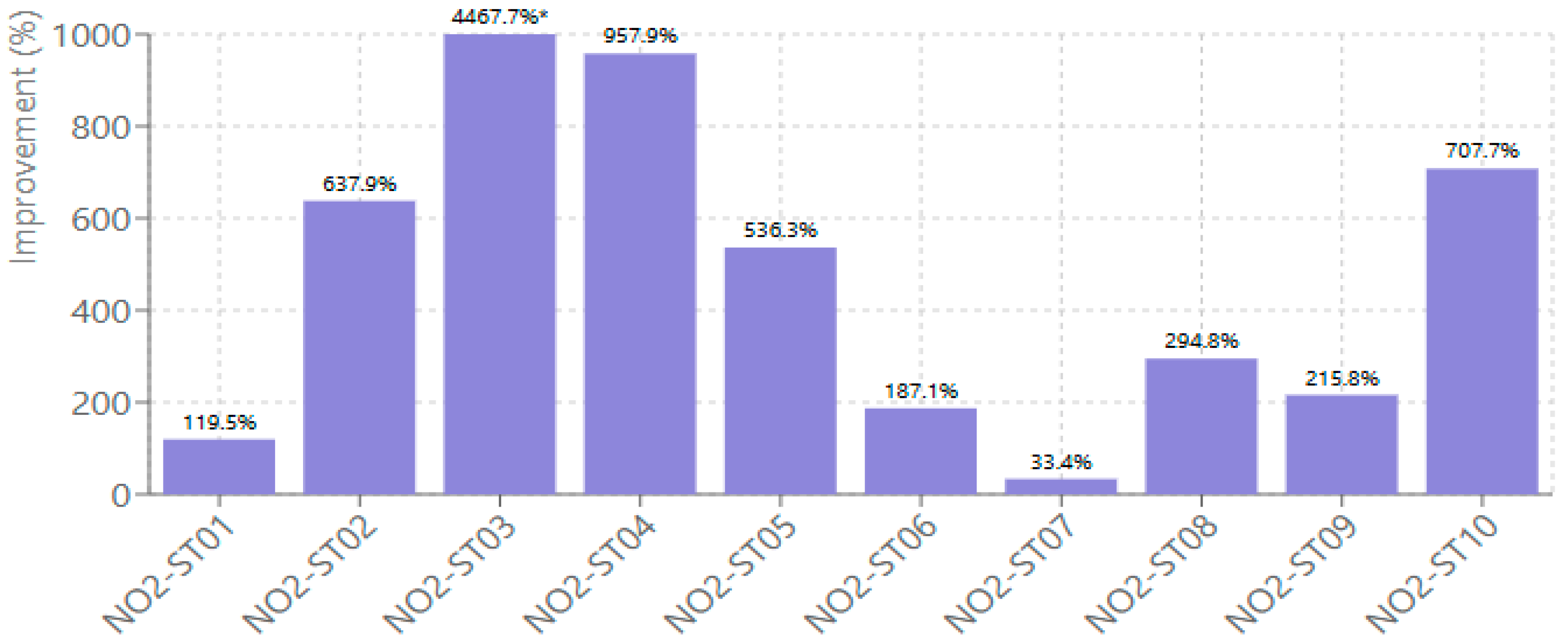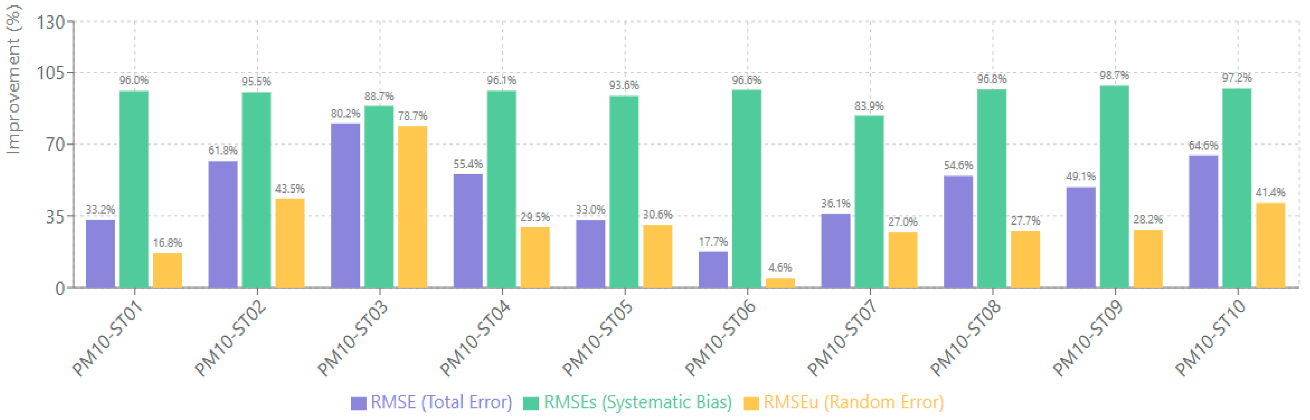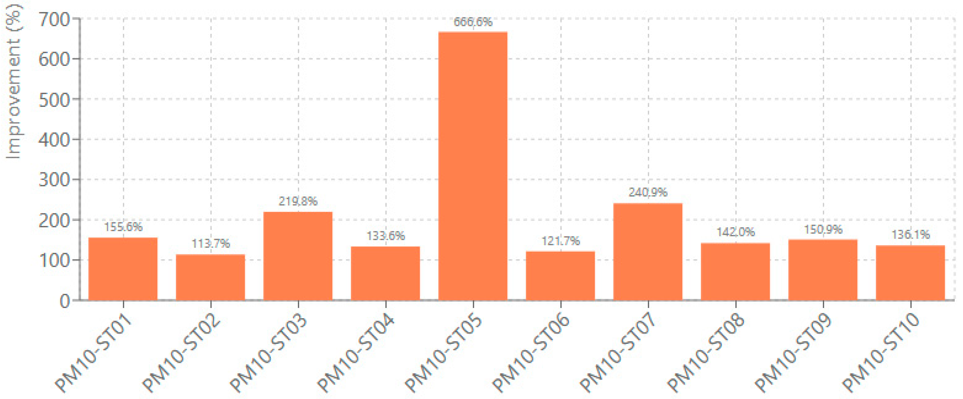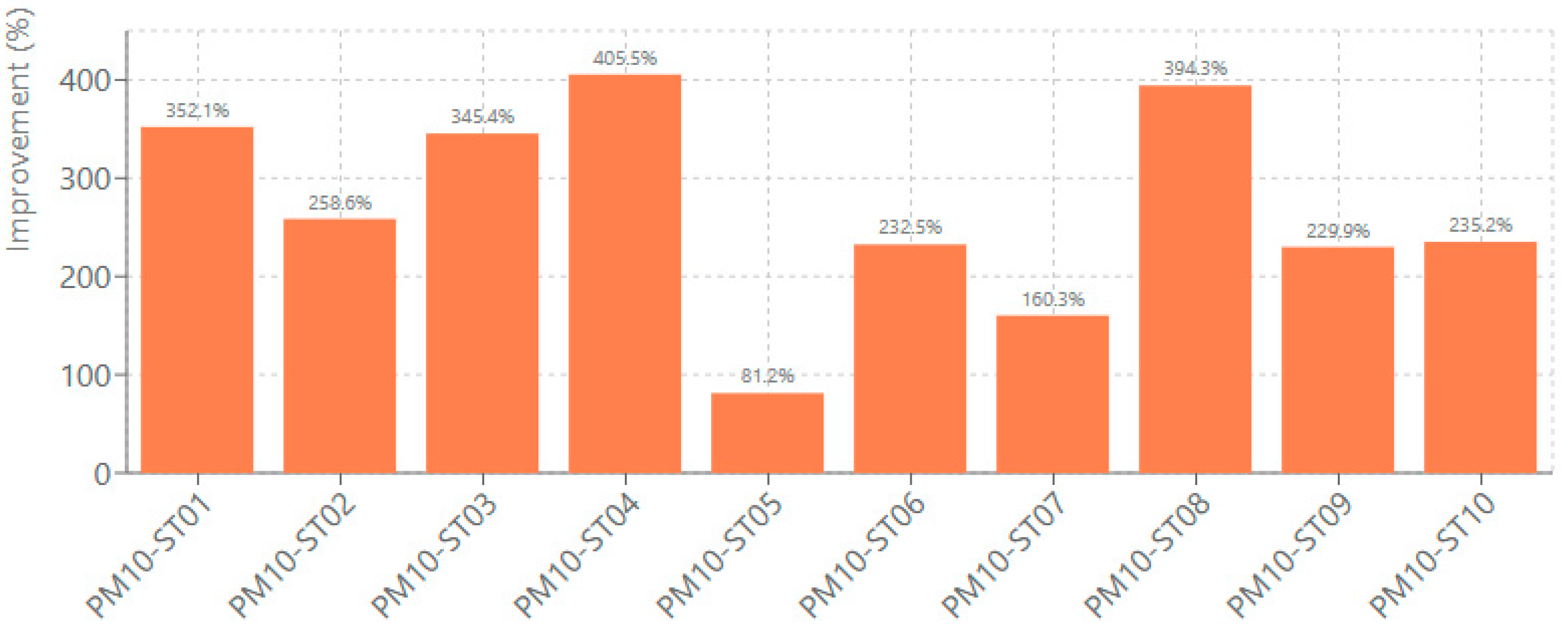 Station-specific analysis revealed distinct performance patterns across the monitoring networks. For NO2 predictions, stations NO2-ST01 and NO2-ST09 consistently demonstrated the greatest improvements across multiple metrics, while stations NO2-ST05 and NO2-ST07 showed more conservative but still meaningful enhancements. For PM10 predictions, station PM10-ST03 achieved notable performance across error reduction metrics, while station PM10-ST07 excelled in agreement metrics.
