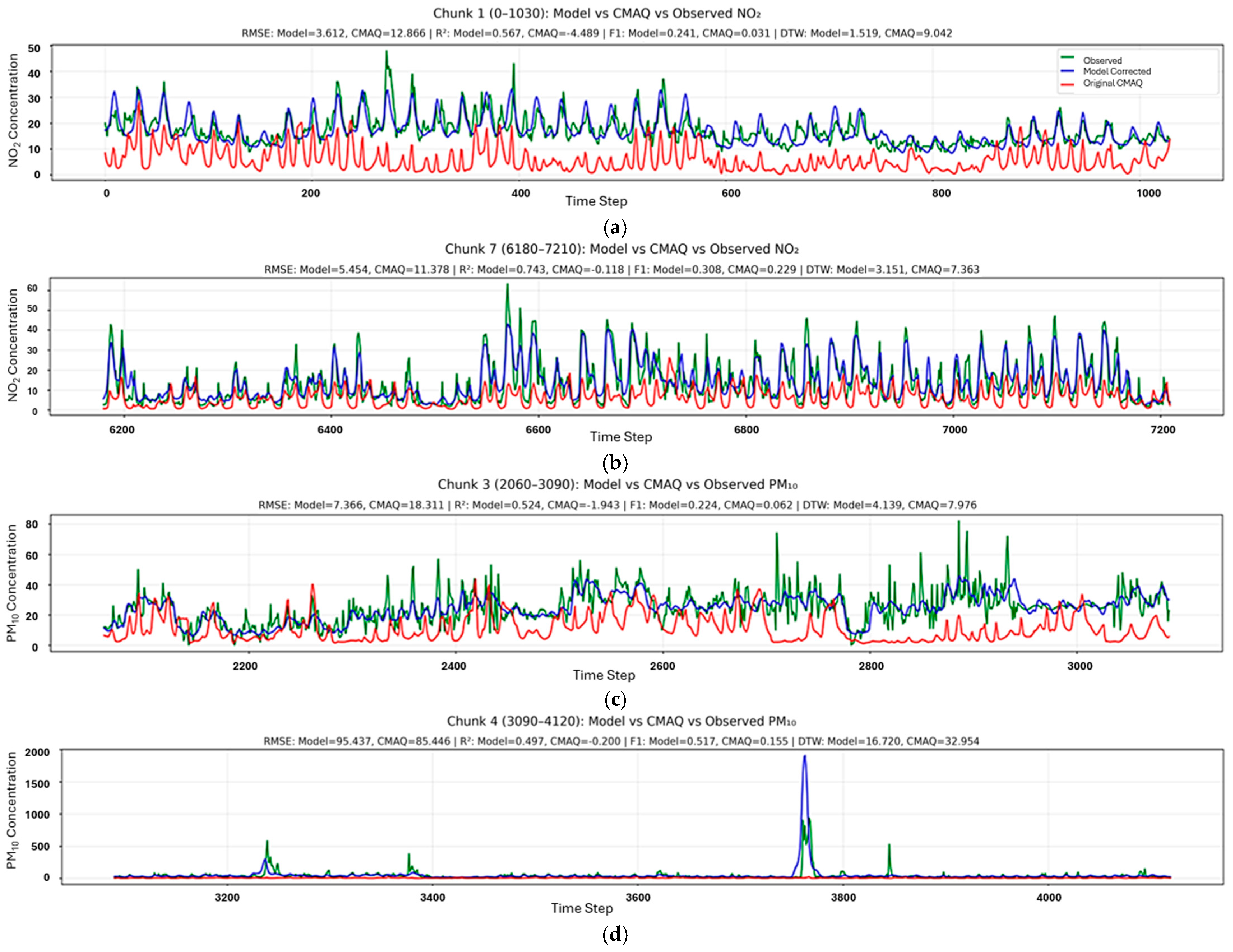 These results establish that the hybrid CNN-LSTM bias correction methodology provides a reliable and general approach for enhancing chemical transport model outputs across different pollutant types. They offer significant improvements in forecast accuracy, temporal alignment, and peak event detection, capabilities that are essential for operational air quality management systems.