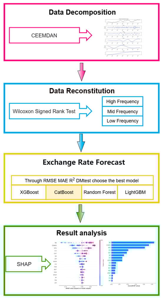 The technical rationale for integrating these specific components is threefold. First, while CEEMDAN effectively handles the non-stationarity of exchange rates, the resulting IMFs often contain redundant noise or fragmented information. By introducing PE as a reconstruction criterion, we bridge the gap between signal processing and economic intuition, ensuring that the input features for the machine learning stage are aligned with distinct market frequencies. CatBoost was chosen as the primary forecasting engine; theoretically, its ordered boosting mechanism is designed to combat prediction shift and gradient bias, which often plague financial time series with complex temporal dependencies. This aligns with our empirical findings where CatBoost consistently outperformed other ensemble methods in terms of predictive accuracy. Finally, the integration of SHAP transforms the CatBoost model from a black-box into a structural analysis tool. Unlike traditional importance metrics that only rank features, our SHAP-based approach quantifies the marginal contribution of each economic driver in original units, providing a rigorous, game-theoretic basis for comparing drivers across different time horizons. This integrated pipeline ensures that our findings are both statistically robust and economically interpretable. A comprehensive exposition of the mathematical principles and operational procedures for each component of this framework is provided in the following subsections.