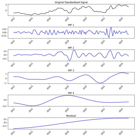 First, the CEEMDAN method was used to decompose the monthly exchange rate into four IMFs from high to low frequency plus one residual, as shown in Figure 2. To characterize their time scales, we calculated the dominant periods of each IMF using the Welch power spectral density estimate. Specifically, IMF1 (peak period: 5.7 months) exhibited significant high-frequency fluctuations, characterized by rapid oscillation and relatively small amplitude. IMF2 (20.1 months) and IMF3 (38.5 months) displayed similar fluctuation characteristics in terms of amplitude and periodic variation. Compared to IMF1, the fluctuation frequencies of IMF2 and IMF3 were notably lower with longer periods, manifesting as medium-frequency oscillations. Finally, IMF4 and the residual exhibited distinct low-frequency characteristics, with periods exceeding 77 months.