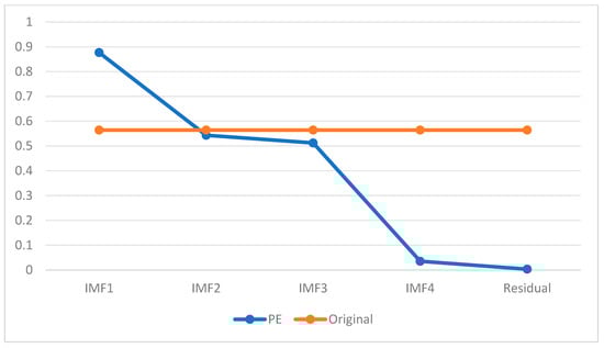 Next, PE was used to assess the complexity of the five IMFs. A larger PE value indicates a higher degree of complexity in the sequence. We plotted the PE values of the original sequence in Figure 3 to identify which subsequences were closer to each other, followed by their classification and reconstruction. The IMFs were divided into three categories based on their PE values in comparison to the original sequence: those with PE values close to, smaller than, or larger than the PE value of the original sequence (Zhang et al., 2014) [48]. As shown in Figure 3, the PE values of IMF2 and IMF3 were close to those of the original sequence, the PE value of IMF1 was significantly higher than that of the original sequence, and the PE values of IMF4 and the residual were noticeably lower.