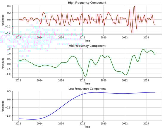 In conclusion, we adopted a reconstruction strategy primarily driven by PE values and corroborated by the time-scale analysis from PSD. IMF1 was classified as a high-frequency component, IMF2 and IMF3 were combined into a medium-frequency component, and IMF4 and the residual were grouped into a low-frequency component. The signal graphs of the high, medium, and low-frequency components are shown in Figure 4. Table 3 reports the statistical metrics of these frequency components.