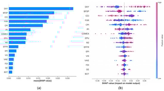 The higher values of Brent crude oil futures settlement price (BFSP) (red dots) were concentrated in the region with negative SHAP values, indicating that an increase in BFSP leads to a decrease in the USD/CNY exchange rate, and thus an appreciation of the RMB against the USD. This view is supported by Liu et al. (2021) [49], who studied the relationship between oil prices and exchange rates in seven oil-importing and seven oil-exporting countries. Their findings show that when oil prices rise (or fall), foreign currencies appreciate (or depreciate) against the USD.