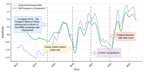 Generally speaking, medium-frequency exchange rate fluctuations reflect the medium- to long-term trends in the economy and policy. For example, the effects of government or central bank monetary policies take time to manifest, and the persistent impact of event shocks gradually influences exchange rate movements. Figure 7 visually aligns specific macroeconomic shocks with the extracted medium-frequency component. Instead of random noise, the fluctuations capture the persistent impact of structural breaks and policy shifts. Notably, the sharp adjustments correspond to the 2015 RMB exchange rate mechanism reform, the escalation of U.S.–China trade frictions (2018), and the global monetary policy divergence following the COVID-19 pandemic. In particular, the sustained upward trend starting in 2022 reflects the aggressive interest rate hikes by the Federal Reserve, confirming that medium-term exchange rate dynamics are largely driven by policy cycles and event shocks. In conclusion, as the effects of policies gradually materialize and the impact of event shocks continues to unfold, market expectations and risk preferences adjust, driving noticeable fluctuations in exchange rates in the medium-term. These fluctuations reflect the market’s gradual response to macroeconomic conditions and policy changes, making the medium-frequency exchange rate an important indicator for observing the effects of economic policies and the impact of major events.