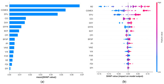 Figure 8a,b presents the importance ranking of 16 variables for low-frequency exchange rates and the SHAP summary plot, respectively. As shown in Figure 8a, the money supply ratio (M2) and gold futures prices (COMEX) were the dominant factors in the long run. Economic Policy Uncertainty (EPU) also showed a high importance score, indicating that long-term exchange rate trends are primarily anchored by monetary fundamentals and global risk hedges. Figure 8b reveals the underlying logic. For M2, red dots (high values) were concentrated in the positive SHAP region, suggesting that a relative increase in China’s money supply compared to the U.S. exerts long-term depreciation pressure on the RMB. For COMEX, high values (red) were also associated with positive SHAP values. This aligns with the view of Li (2024) [3], where rising commodity and gold prices may signal increased import costs or global dollar strength, leading to RMB depreciation in the low-frequency component.