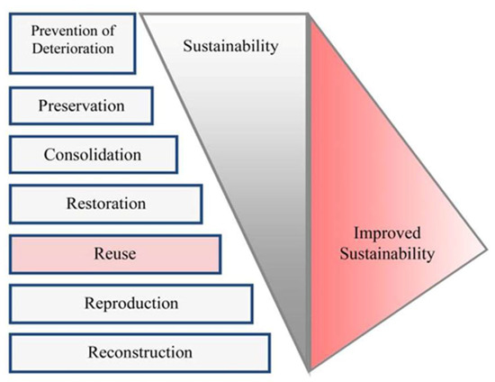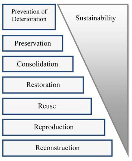 It is obvious that a lower degree of intervention in historic buildings is a better choice for realizing sustainability as it lowers costs in relation to materials, transport, energy and pollution when compared to the erection of new buildings. Therefore, it can be said that there is a preferable direction for choosing the best intervention in historic buildings starting from the most conservative (prevention of deterioration) to the most radical (reconstruction), based on the degree to which the building is altered (Figure 1).
