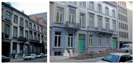 A typical example is demonstrated by the refurbishment of the 140-year-old Renewable Energy House (REH) in Brussels (Figure 3). The House was refurbished to minimize energy consumption and to explore different methods for integrating renewable energy technologies, making it a 100% renewable energy building. The concept was designed to reduce the annual energy consumption for heating, ventilation and air conditioning by 50% when compared to a reference building, and to cover all the needs for heating and cooling by 100% renewable energy sources (biomass wood pellets, geothermal heating, solar thermal heating, and absorption cooling). The building was equipped with a series of energy efficiency technologies (insulation of the façades and roof, highly efficient double glazing, high-efficiency lamps, ventilation with heat recovery). In addition to these measures, the building features the latest photovoltaic (PV) technologies (modules, thin film, semi-transparent) for the production of electricity. It was observed that in the REH refurbishment project, all of the measures implemented contributed to reducing the energy consumption of the building in addition to the benefit of increasing the comfort for its tenants [11].