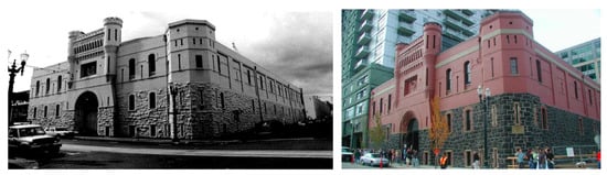 Another example of the sustainable conservation of a heritage building is The Gerding Theater at the Portland National Guard Armory Annex in Portland, OR, USA (Figure 4). The building was built in 1891 and was listed on the National Register of Historic Places in 2000. After adaptive-reuse in 2006, it became the First Building on the National Register of Historic Places to achieve LEED (Leadership in Energy and Environmental Design, is the green building rating system developed by the United States Green Building Council) Platinum status [12]. The project included a 600-seat main stage Theatre, a 200-seat studio stage theatre, administrative offices, costume space, rehearsal space, gallery, cafe, and a landscaped silver park along the north edge of the building [13].
