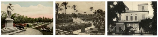 The owner of the villa was Sir John Antoniadis, a British subject of Greek origin. In the late 1850s or early 1860s, he developed the garden estate and villa on the banks of the Mahmoudieh Canal, which was then the site of the palatial residences of the aristocracy of Alexandria [18,21]. A Greek architect, Paul Lascaris, designed the Antoniadis Palace and Gardens, and two Belgian landscapers, Monfront Bey and Paul Richard (Director of Alexandria’s gardens) embellished the garden based on the model of the seventeenth-century Versailles Gardens with avenues of trees and a terrace raised above the parterres (Figure 6) [17,22]. The Italian Terrace Gardens were designed by Pericles Lascaris in 1891 [18].