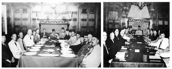 (left) Initiating the Anglo-Egyptian treaty, Antoniadis Palace, Alex, 12 August 1936. (right) A preparatory committee of senior Arab officials, chaired by the Egyptian Prime Minister Mustafa El-Nahas, meets in Alexandria on 25 September 1944 to prepare for the launch of the Arab League [25,26].