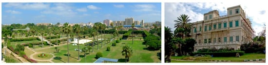 Villa Antoniadis and its gardens lie at the southern entrance of Alexandria, and is surrounded by some 48 hectares of greenery, which include the Antoniadis gardens, the flower gardens, the Nouzha Gardens [17] (Figure 5), and the Alexandria Zoological and Botanical Gardens. The Antoniadis gardens include beautiful statues and a tropical greenhouse. There are archaeological remains including a Gnostic tomb dating back to the mid-third century AD and a cistern [18,19,20].