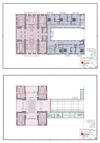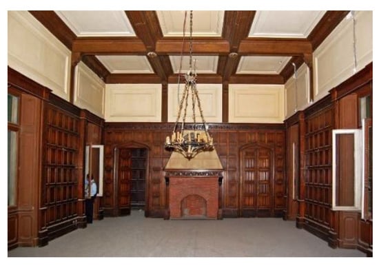 The existing building was built in two phases: the original building dates to the 1860s, while the eastern extension was added in the early twentieth century. The difference can be observed in the interior design and structural systems (Figure 10, Figure 11 and Figure 12).