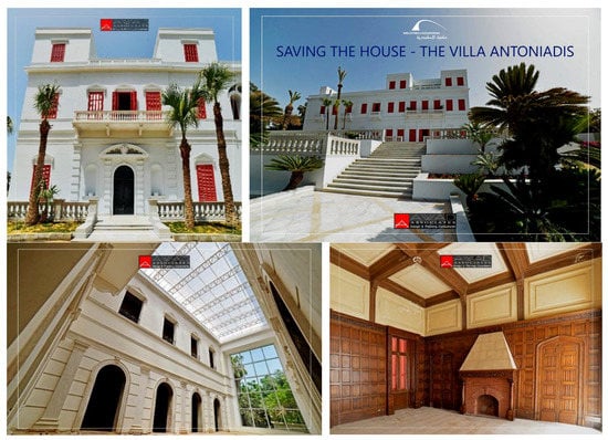 - Khalil, A.M.R. Implementing Sustainability in Retrofitting Heritage Buildings, Case Study: Villa Antoniadis, Alexandria, Egypt. Faculty of Fine Arts, University of Alexandria. 2015. Available online: https://www.academia.edu/33229941/IMPLEMENTING_SUSTAINABILITY_IN_RETROFITTING_HERITAGE_BUILDINGS_CASE_STUDY_VILLA_ANTONIADIS_ALEXANDRIA_EGYPT (accessed on 21 May 2018).