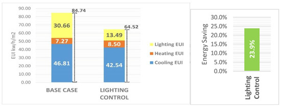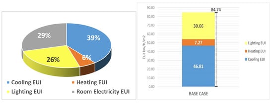 In reference to the base case energy distribution (Figure 17) and the modified case, it was remarkable that the cooling, heating and lighting EUI share decreased from 71% to 61% of the total energy use intensity of the building, with 36.5% savings in the cooling, heating and lighting energy consumption.