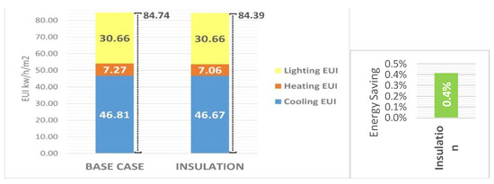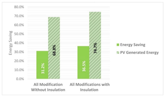 Therefore, the simulation was repeated while adding back the internal wall insulation, which helped to reduce the heating energy increase to only 5.4%; subsequently, the total energy savings increased to 36.5% and the energy generation share to 74.7% (Figure 30).