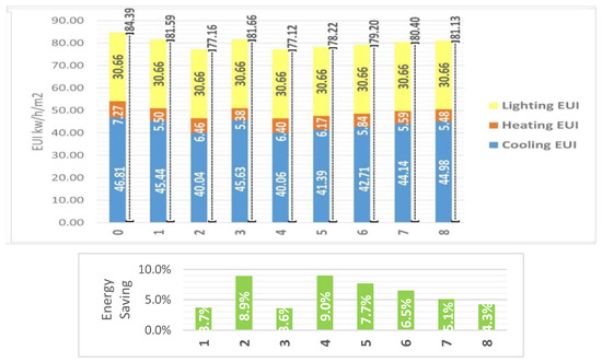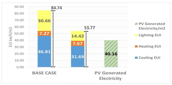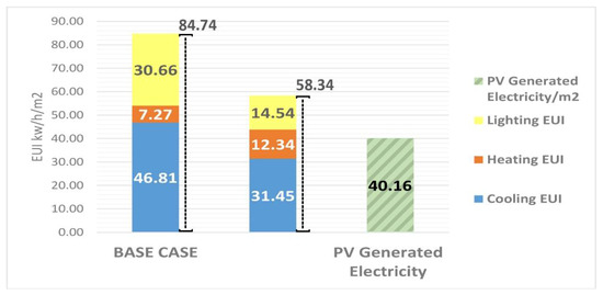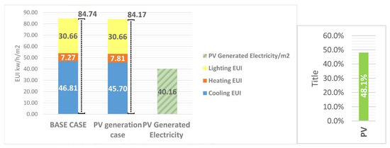 Adding PV panels on the roof helped to reduce the cooling EUI by 2.4% and the overall EUI by 0.7% as the panels acted as shading on the roof to eliminate solar radiation from passing inside the building through its roof (Figure 27).