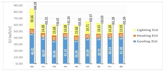 It was remarkable that the heating EUI was greatly increased, which could be due to the reduction in heat gain from the internal lighting and the reduction of the solar heat gain due to the added shadings.