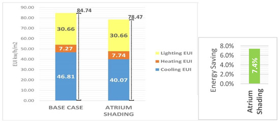 Cooling, heating and lighting EUI and Energy saving of the Atrium shading case when compared to the base case showed a 7.4% saving.