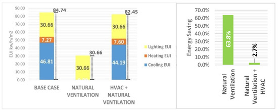 Cooling, heating and lighting EUI of the natural ventilation case and natural ventilation + HVAC case when compared to the base case showed energy savings of 63.4% and 2.7%, respectively.