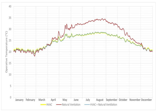 Operative temperature for the HVAC base case, the natural ventilation case, and the HVAC + natural ventilation case.
