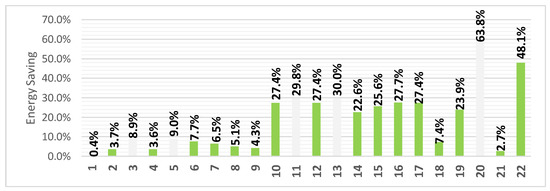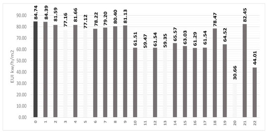 Different cases of EUI and energy saving percentages. 0. Base case; 1. Wall insulation; 2. Clear double glass with air gap; 3. Tinted double glass with air gap (not applicable as it affects the preserved exterior façades); 4. Clear double glass with argon gap; 5. Tinted double glass with argon gap (not applicable as it affects the preserved exterior façades); 6. Clear double glass with internal louvers always on; 7. Clear double glass with internal louvers that turn on when solar radiation exceeds 120 W/m2; 8. Clear double glass with internal louvers that turn on when solar radiation exceeds 400 W/m2; 9. Clear double glass with internal louvers that turn on when solar radiation exceeds 600 W/m2; 10. Clear double glass with air gap + lighting control; 11. Tinted double glass with air gap + lighting control (not applicable as it affects the preserved exterior façades); 12. Clear double glass with argon gap + lighting control; 13. Tinted double glass with argon gap + lighting control (not applicable as it affects the preserved exterior façades); 14. Clear double glass with internal louvers always on + lighting control; 15. Clear double glass with internal louvers that turn on when solar radiation exceeds 120 W/m2 + lighting control; 16. Clear double glass with internal louvers that turn on when solar radiation exceeds 400 W/m2 + lighting control; 17. Clear double glass with internal louvers that turn on when solar radiation exceeds 600 W/m2 + lighting control; 18. Atrium shading; 19. Lighting control; 20. Natural ventilation only (not applicable as it affects the internal thermal comfort); 21. Natural ventilation + HVAC; 22. Photovoltaic case.