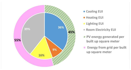 The results showed a 32.8% reduction in cooling EUI, 69.7% increase in heating EUI, and 52.6% reduction in lighting EUI, while the total reduction was 31.2% and generated energy accounted for 68.8% (Figure 29).
