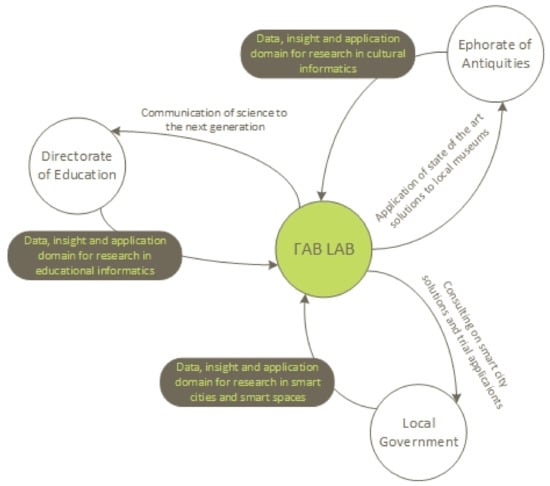 A brief visual summary of the lab’s cooperations is provided in Figure 4. The outgoing arrows indicate the additional efforts (with respect to the more conventional laboratories) that the lab is undertaking and are seemingly unrelated to research. These include developing and providing applications for the local museums, giving presentations in schools, serving as a technical consultant for the municipality and developing applications for the city.